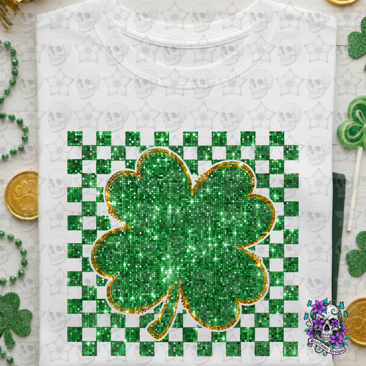 Green & Gold Faux Glitter Checker Shamrock; PNG DIGITAL FILE ONLY
