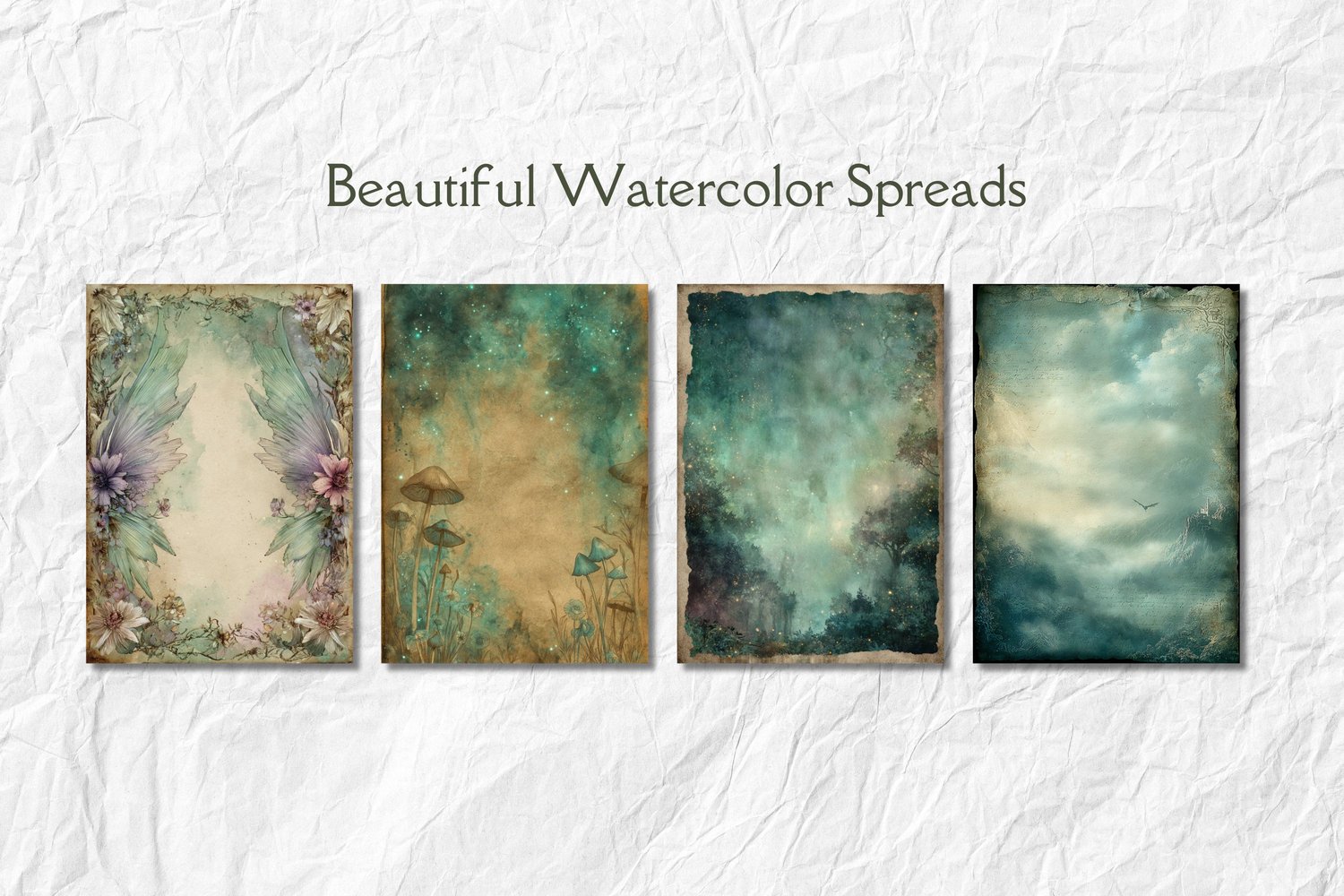 Each page has been delicately painted in a high-quality watercolor style with muted, atmospheric tones of moss green, teal, lavender, rose, and sepia. Borders, arches, and floral motifs keep the designs neat and versatile — so they work beautifully as both decorative and writing pages.