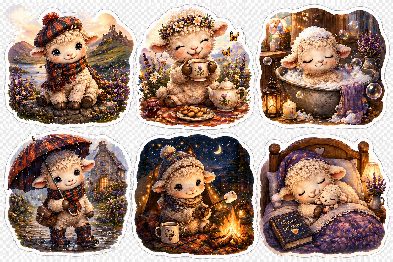 Fluffy the Little Lamb โ Cozy Highland Moments Sticker Pack ๐โจ - ๐ธ Whatโs included: 6 high-quality PNG stickers Transparent backgrounds Large, detailed designs (perfect for print & digital use)