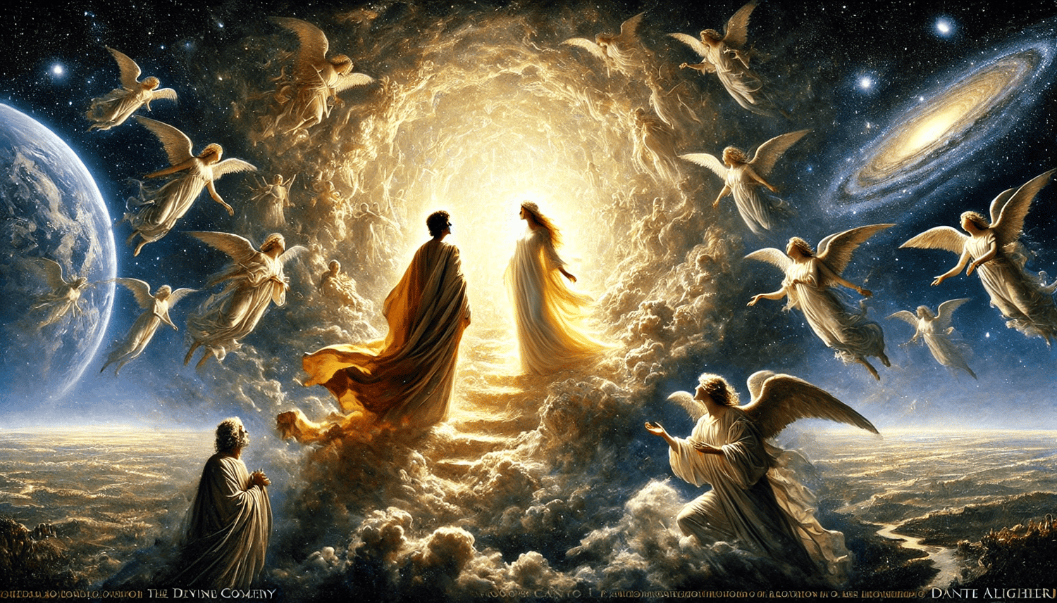 Dante and Beatrice ascend beyond the earthly realm, entering the celestial spheres of Paradiso. Surrounded by radiant angels and infinite light, they approach the first circle of heaven, where divine harmony and cosmic beauty merge. This breathtaking artwork captures the transcendence, enlightenment, and infinite wonder of Dante’s final journey.