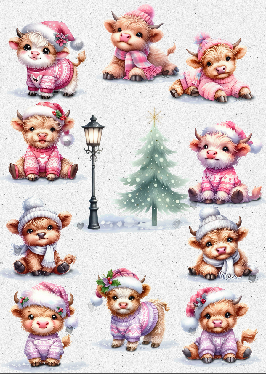 10 Adorable baby highland cows. Additional snow, tree and lantern to make up yours scene. 13 high quality PNG files.