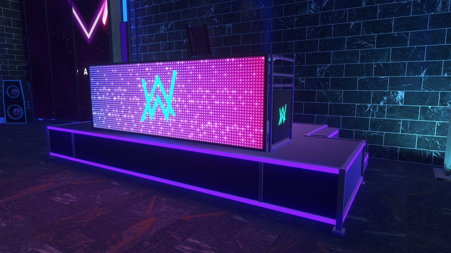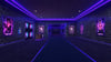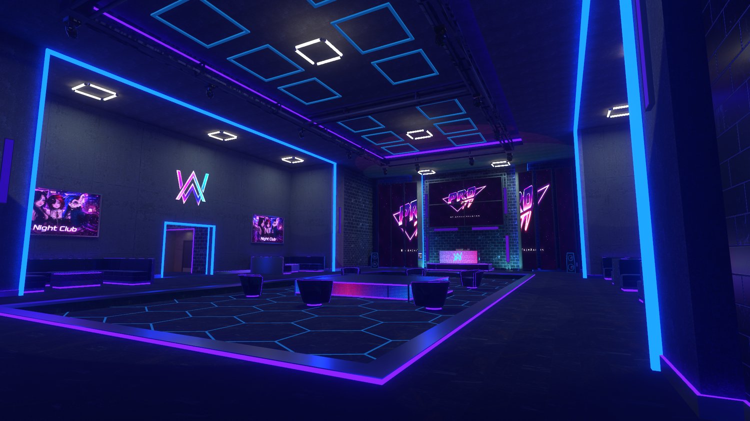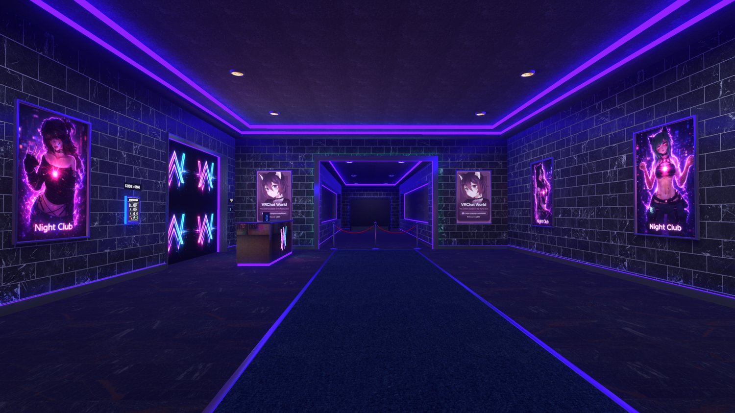 This VRChat nightclub world features a secure lobby with a keypad-based access system, a main stage with a DJ console, integrated video player, AudioLink support, and VRStage lighting.