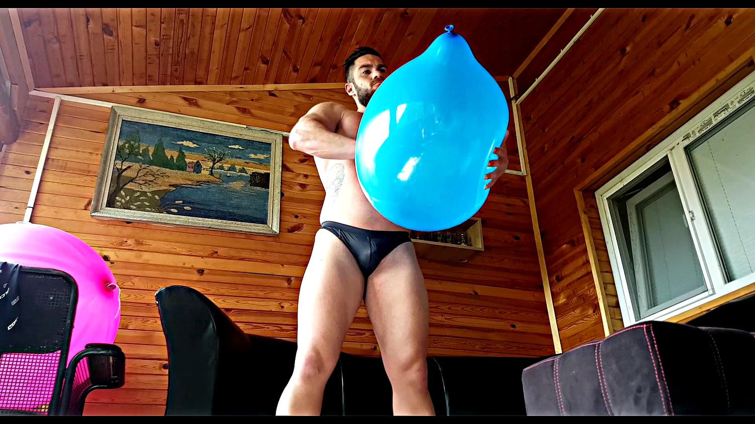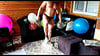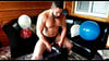 Muscle Guy James pops a lot of balloon of different sizes! He sits, stomps and squeezes balloons