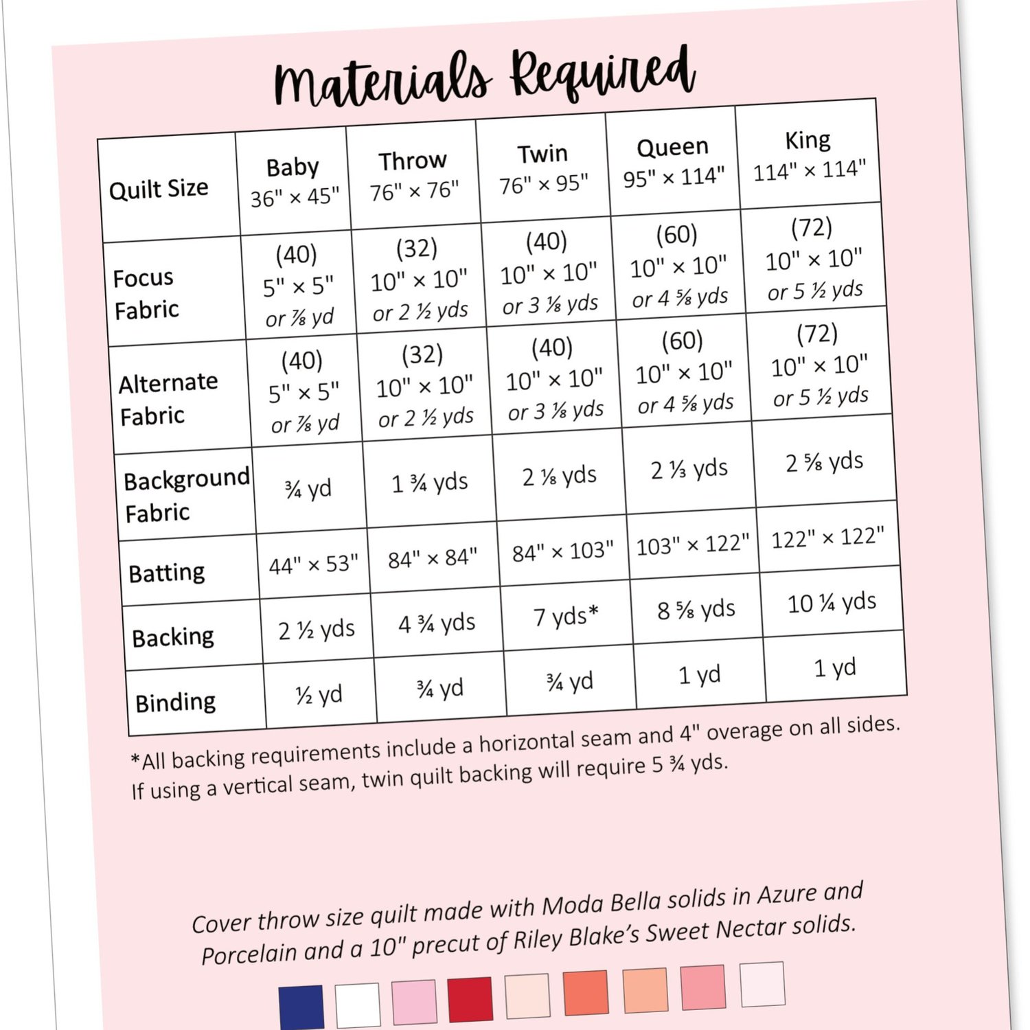 - Throw, twin, queen, and king sizes are ideal for showing off 10" squares (layer cakes)