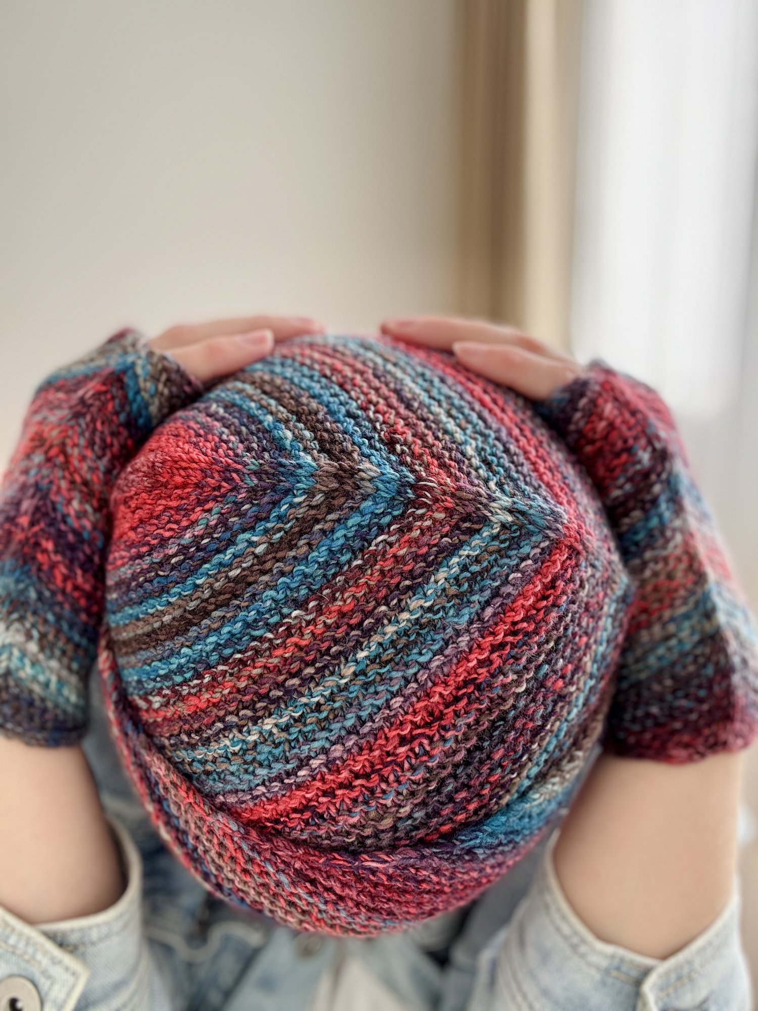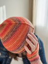 A bias-knit garter stitch hat that folds flat but fits round