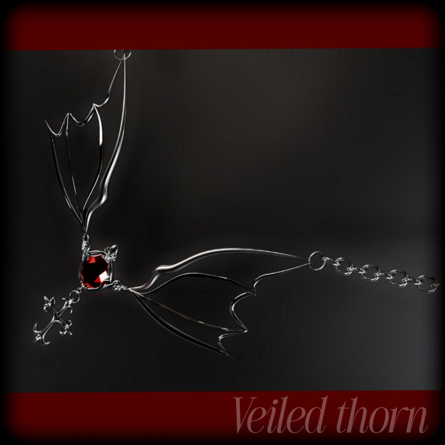 Detailed winged necklace with a ruby and a cross as its main center piece. {chained}