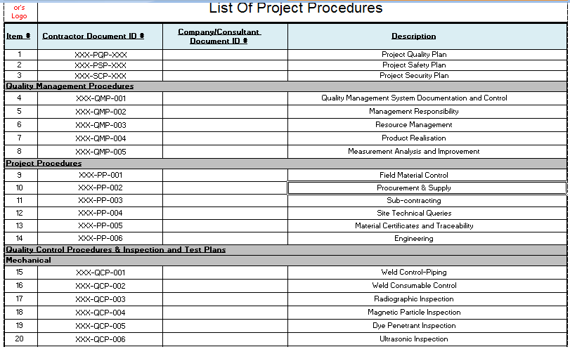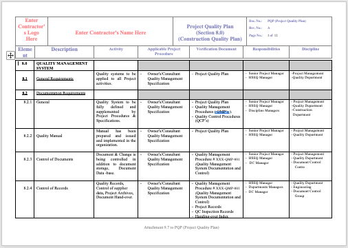 - One PQP Plan Document - Project Quality Plan for Construction (MS Word Format).