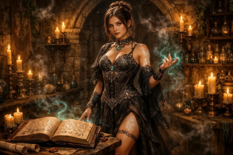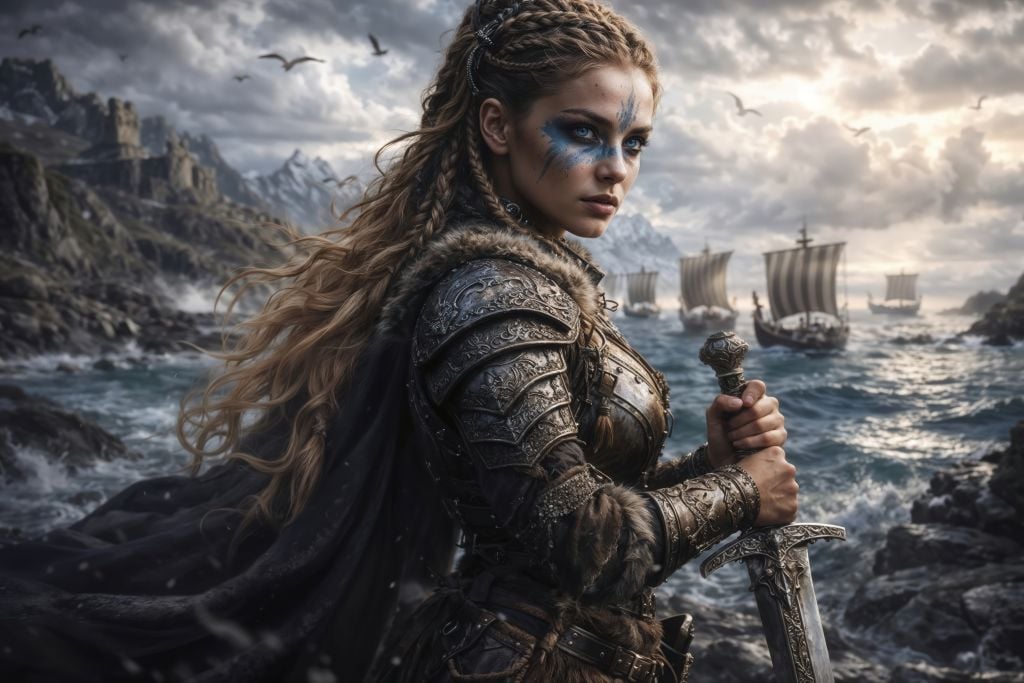 Feel the salt wind. Hear the thunder in the surf. This 10K fantasy artwork captures a fierce shieldmaiden standing on jagged coastal rock—war paint set, armor etched with legend, blade ready—while longships cut across a steel-gray sea behind her.