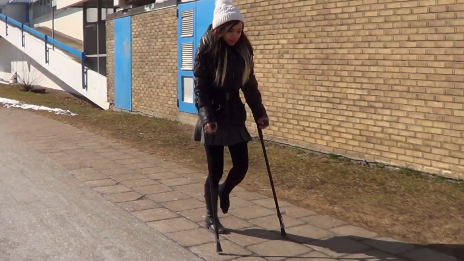 Bunny take her crutches and goes for a walk.Her green SLC is protected in a black sock since it is a cold winter day in Sweden and there is still some snow on the ground