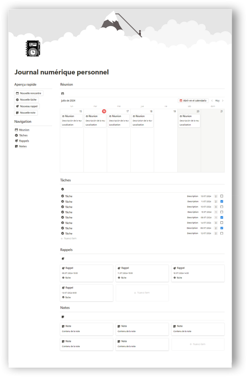 Avec l'agenda numérique personnel, vous disposez de tout ce dont vous avez besoin pour suivre en détail vos activités quotidiennes, ce qui vous permet d'améliorer votre organisation et votre productivité. Idéal pour ceux qui recherchent une solution complète et personnalisable pour gérer leur temps et leurs tâches.