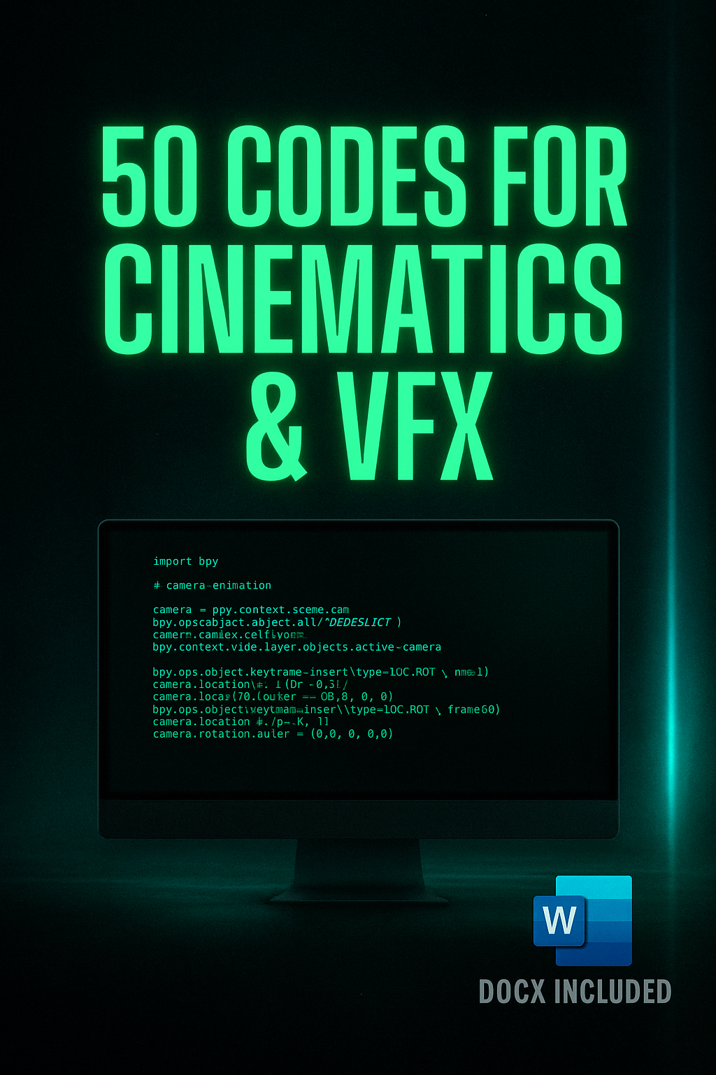 “50 Codes for Cinematics & VFX” gives you ready-to-use scripts and examples to create professional film effects with Python, FFmpeg, Blender, After Effects, Three.js, and more.