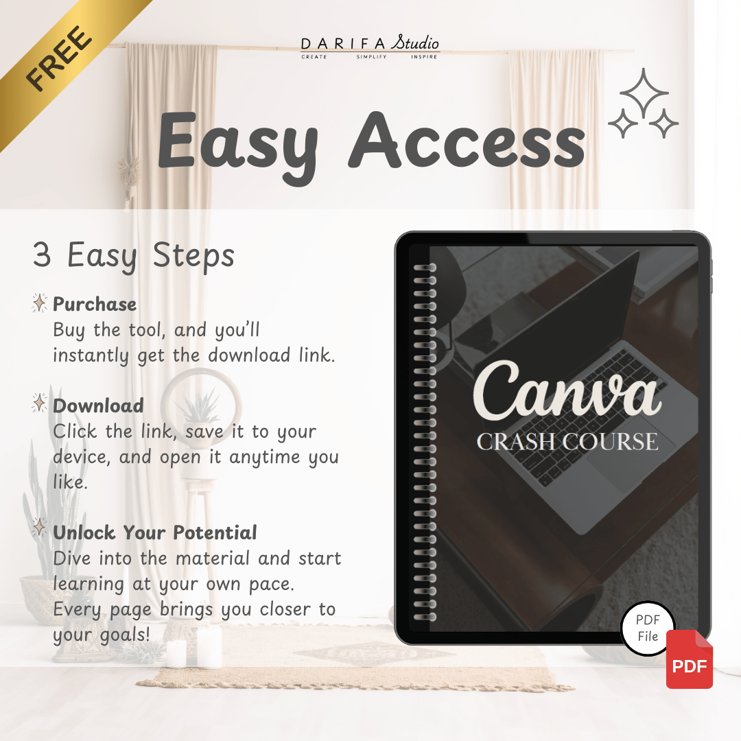 The Canva Crash Course is an editable Canva template designed to help beginners and aspiring designers unlock the full potential of Canva. With step-by-step guidance on navigating the platform, understanding tools, and mastering design essentials, this course empowers you to create professional designs effortlessly.