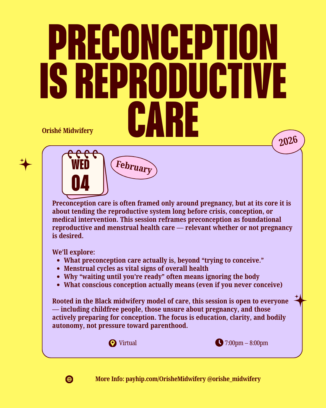 An educational session reframing preconception care as reproductive and menstrual health care. Covers cycles, hormones, reproductive wellness, and informed choice. Open to all genders; pregnancy not required.