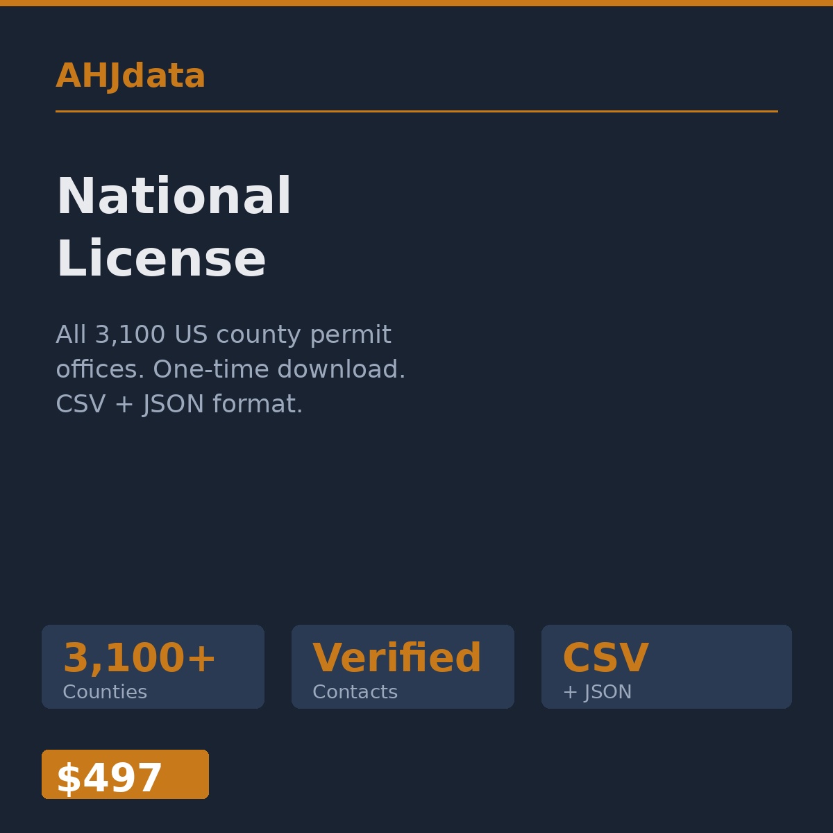 All 3,100+ US county building permit offices in one download. Phone numbers, emails, fee schedules, submission methods, and office addresses. CSV + JSON format. One-time purchase, point-in-time snapshot. 30-day money-back guarantee.