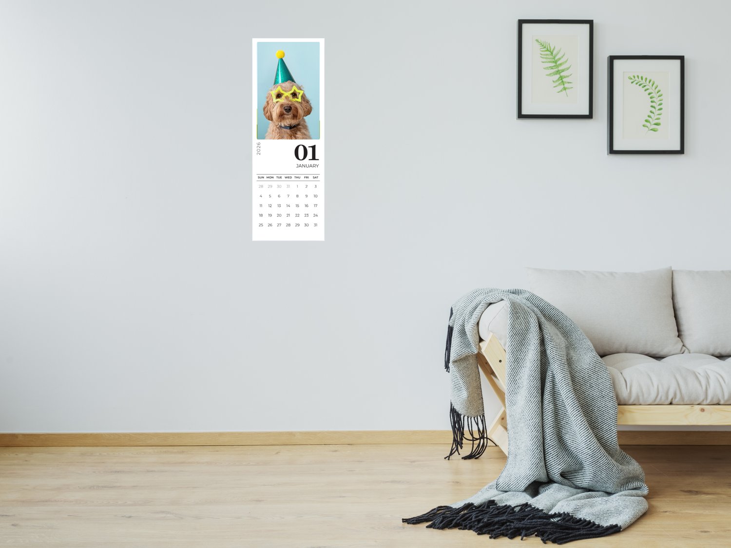 Create a personalized calendar with this vertical slim template, perfect for planners, gifts, or wall art. Sized at 4.134" × 11.7", each monthly page includes a clean date grid and a customizable image area — all editable directly in Canva.