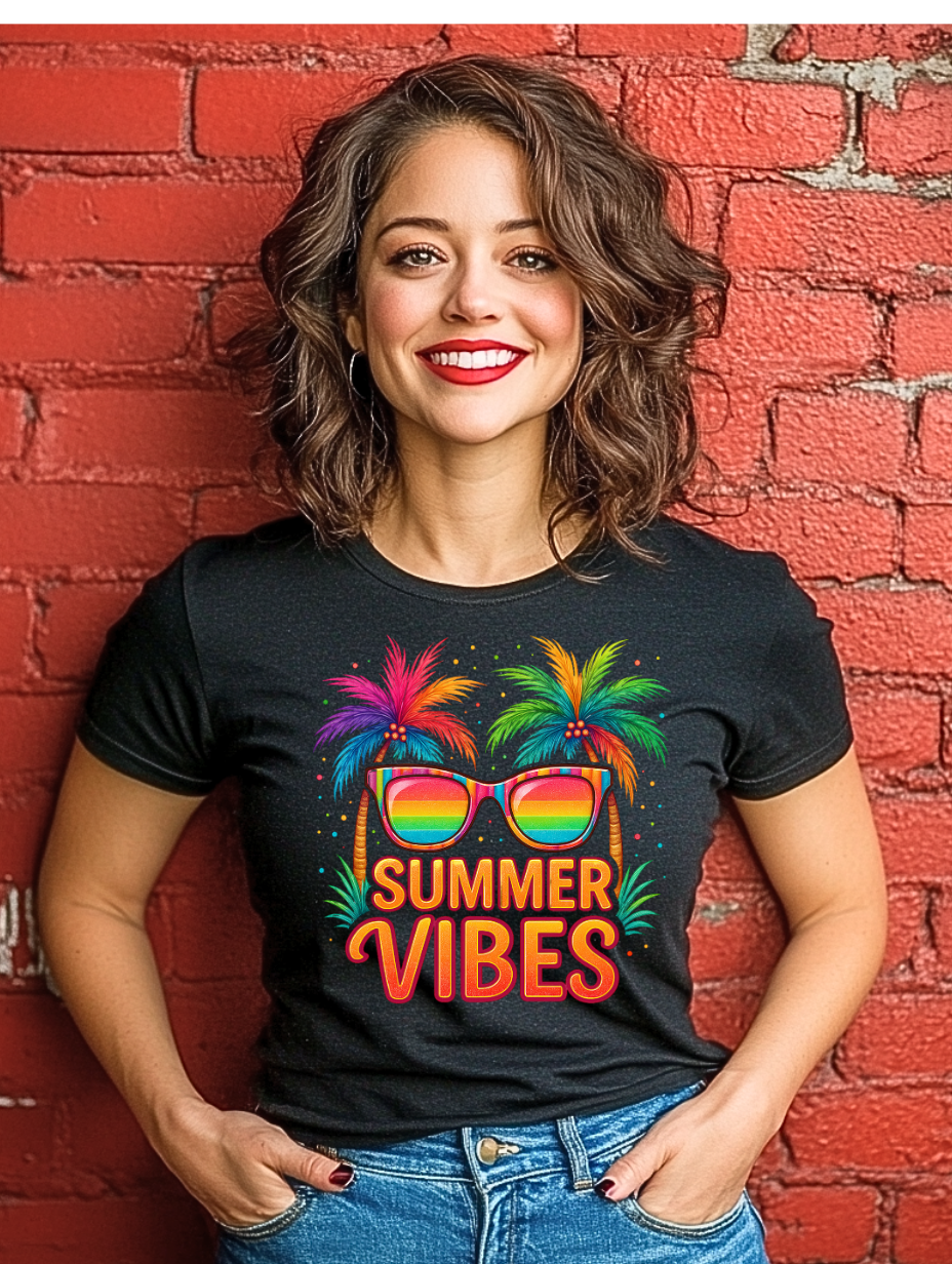 Bring the heat with this vibrant “Summer Vibes” design! Featuring rainbow shades, neon palm trees, and tropical confetti—perfect for your boldest summer creations.