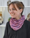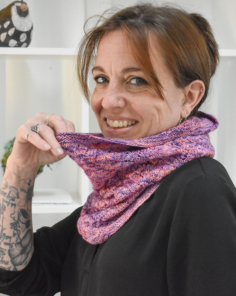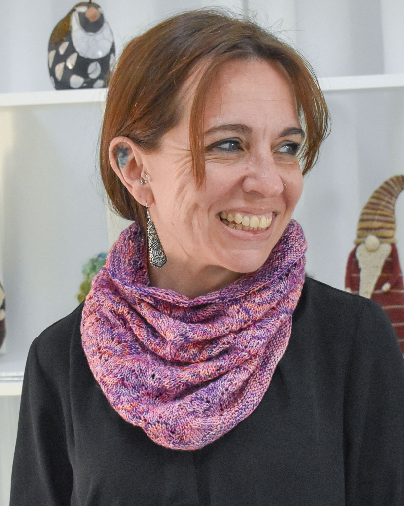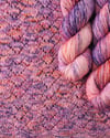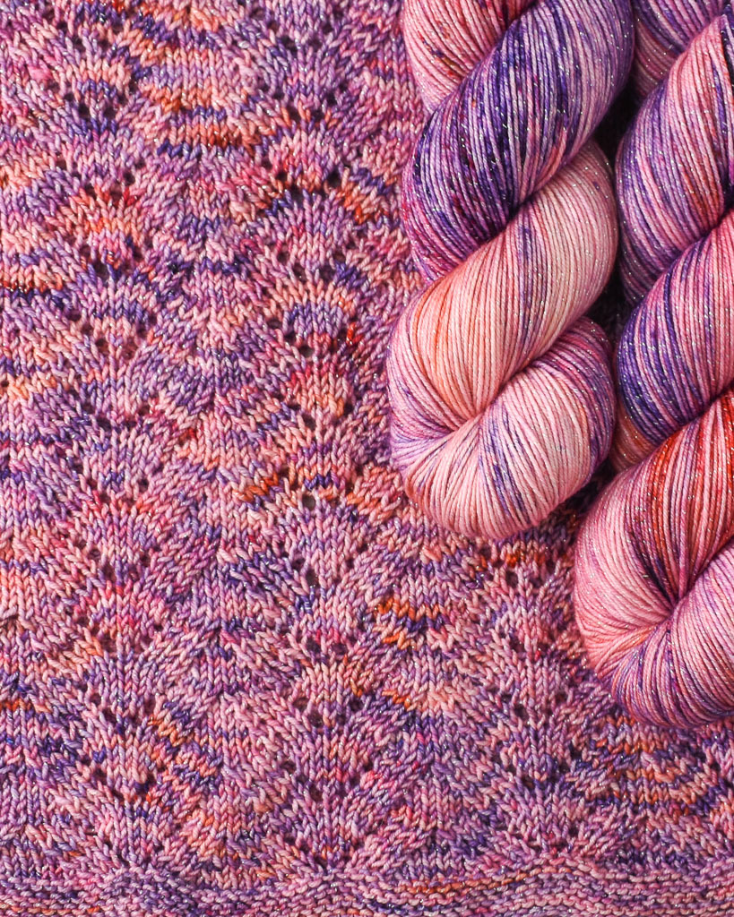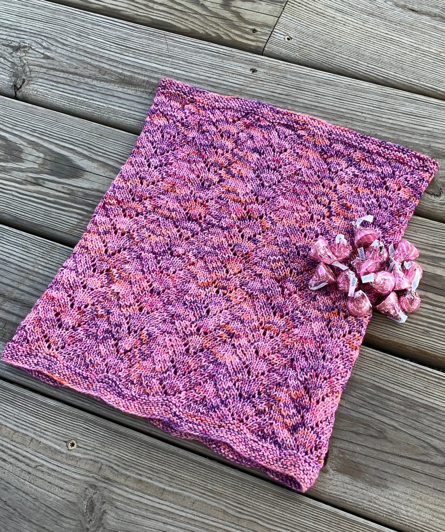 Kisses and Hugs is worked in the round from the bottom up, using a simple 8-row lace pattern that is easy to memorize. The pattern will look nice in lower-contrast variegated yarns, speckles, or solids.