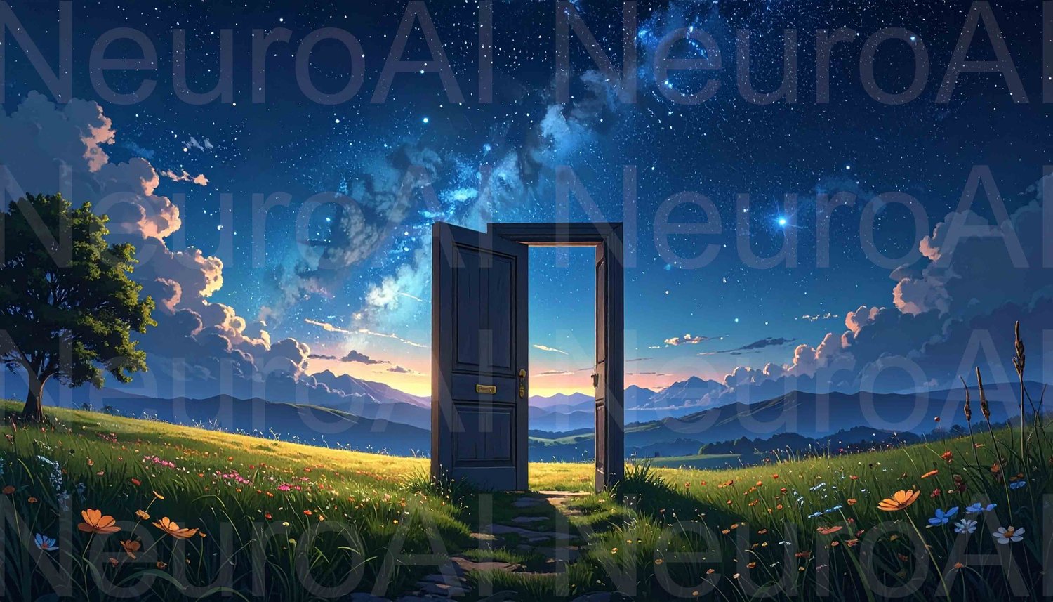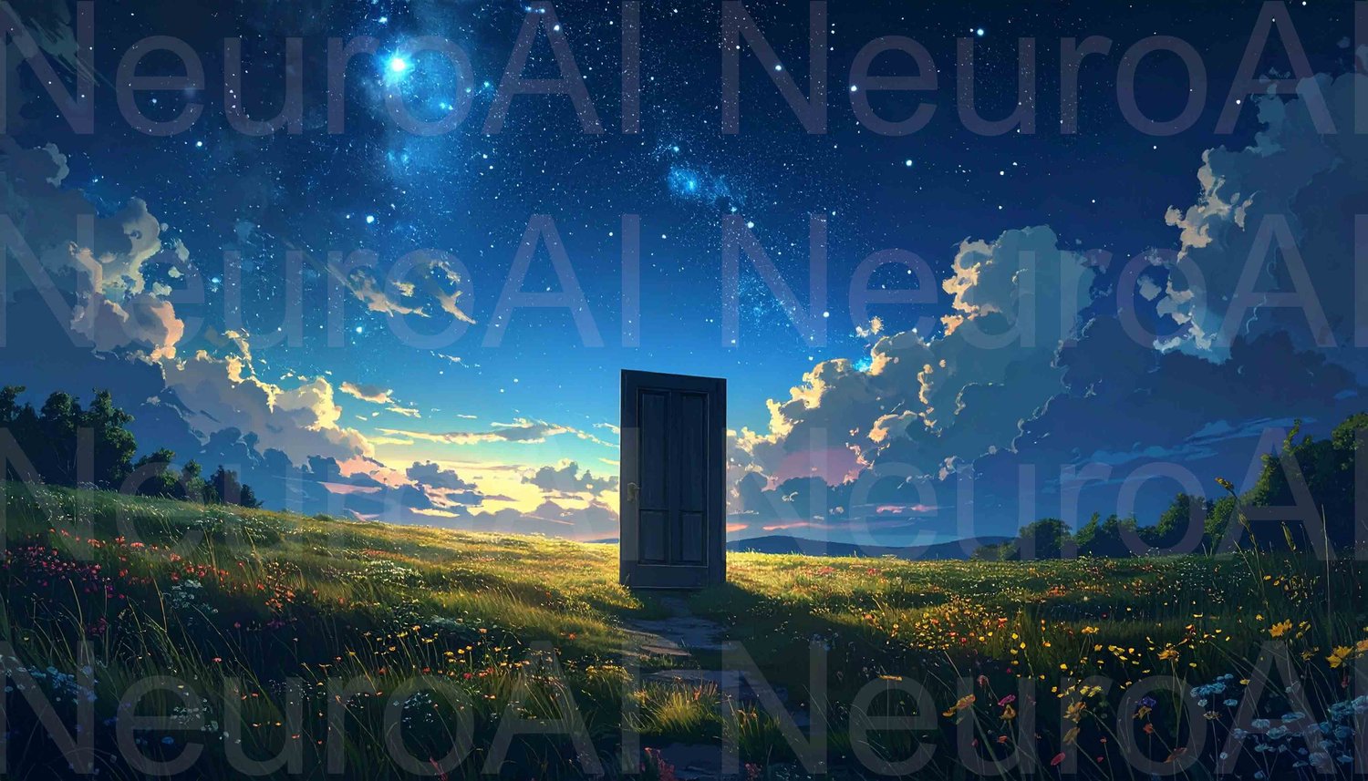 Open door to starry sky awaits in vibrant field