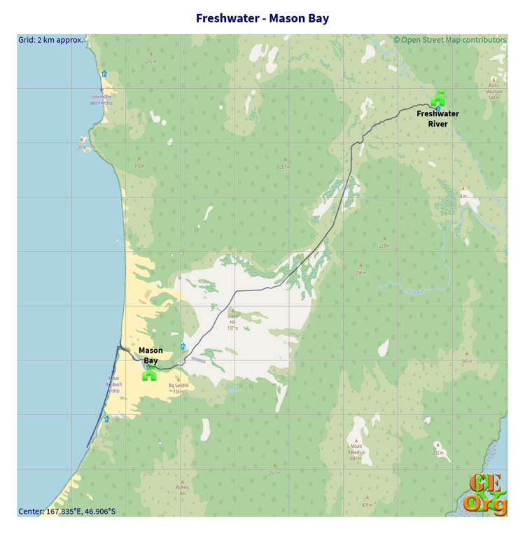 Hiking trail Oban to North Arm (Rakiura Great Walk) and further to Freshwater River (North-West Circuit) on Stewart island: GPS file and OpenStreetMap.
