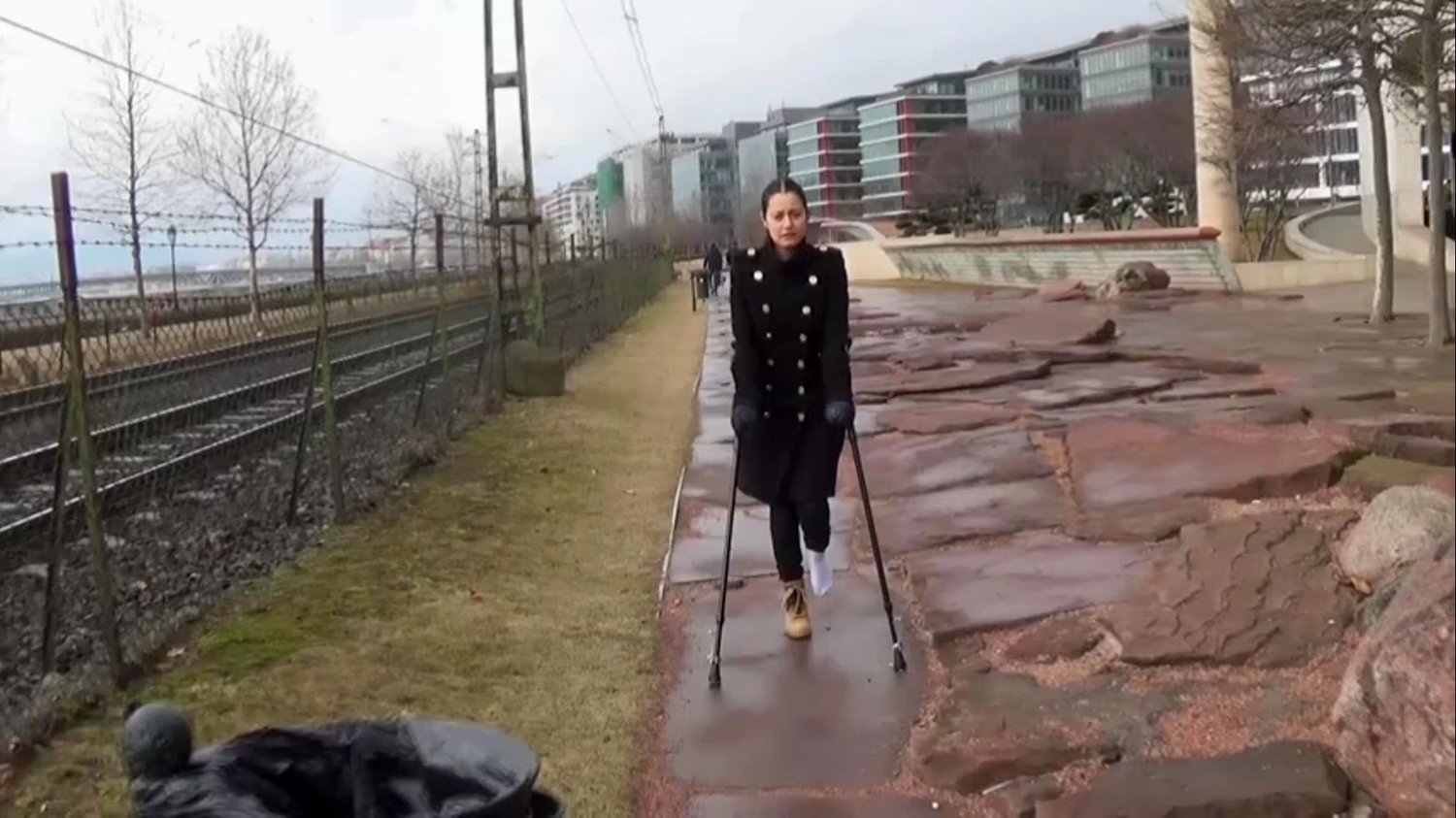 Elisabeth crutch along the railway on her way to a lookout tower in Budapest.She has sprain her left foot and crutch now up in the tower with just a sock over her hur foot.After crutching up and down the tower she continues up the stairs to a bridge that crosses the railway and to go down to the railway station she must crutch down more stairs.