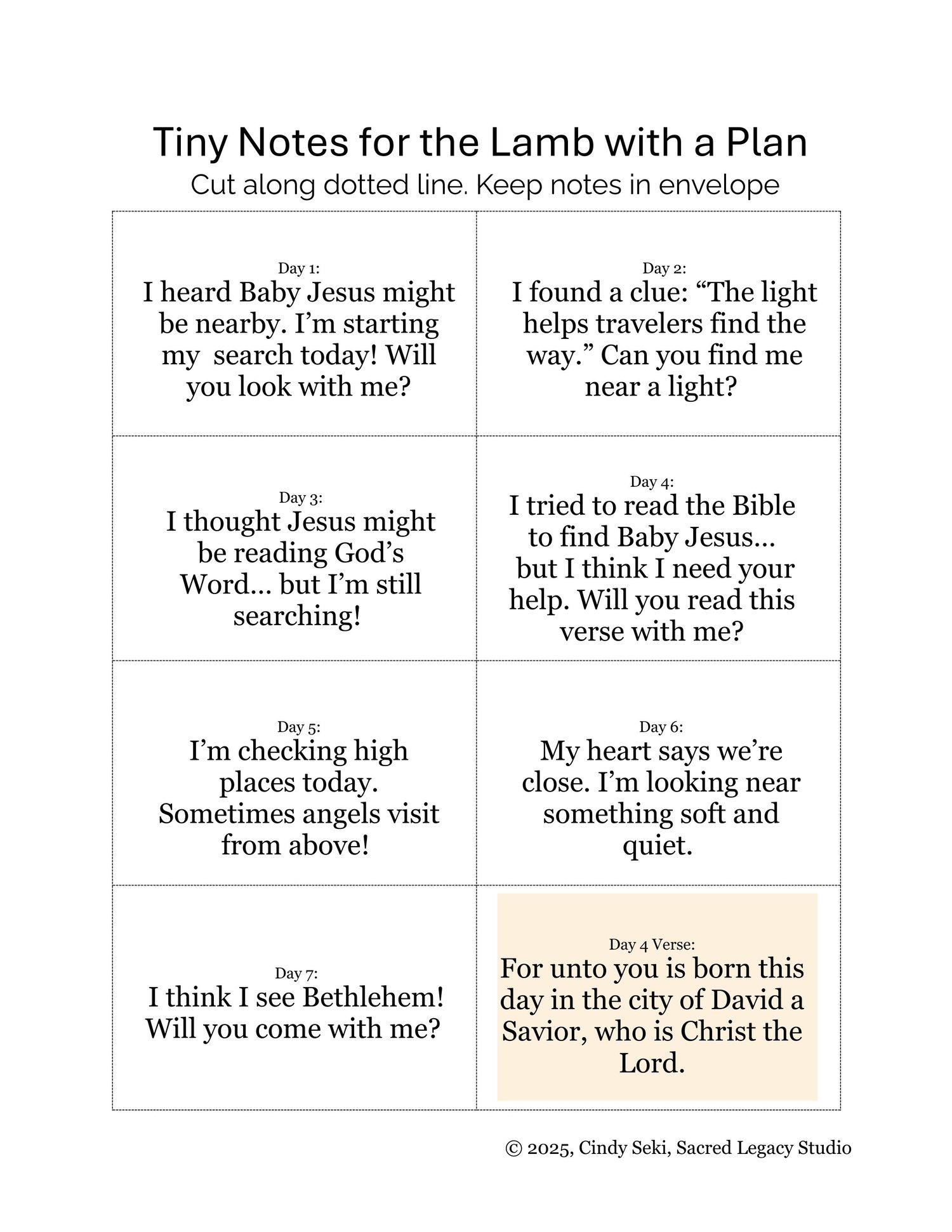 - 25 tiny note cards (plus verse cards and a little “poster”) that serve as daily clues for kids to discover with the lamb.