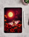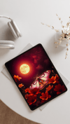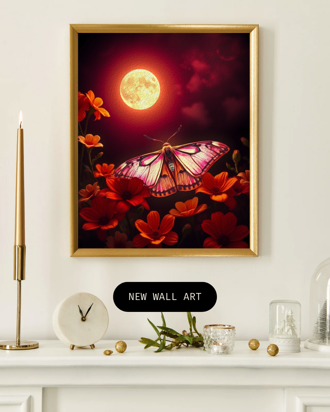 This artwork titled "Radiant Bloom" features a striking orange flower in full bloom, set against a dramatic backdrop of swirling clouds and vibrant colors. The contrast between the bright flower and the dark background creates a captivating visual effect, making it a focal point in any room. The painting evokes a sense of growth and beauty amidst chaos, symbolizing resilience and hope. The surrounding decor, including modern armchairs and pendant lights, complements the artwork and enhances the overall aesthetic of the space.