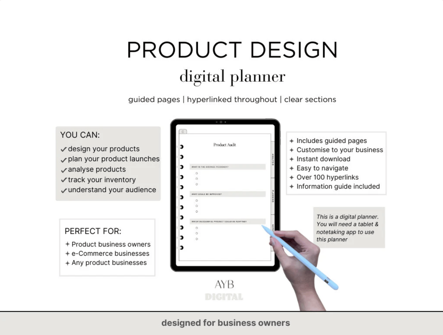 This product design digital planner and workbook helps you to plan, design and develop your products with ease and organisation.
