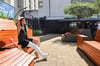 After this long walk through the streets, she has to do a live for her friends, she goes to a beautiful square that has a huge stairs both to go down and to go up, goes to a bench, starts the live and right after her flight approaches.
