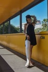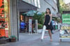 She leaves the hotel and goes to a very busy avenue, where she starts her walk up to blocks, passes by several stores where, of course, she becomes the center of looks and attention.