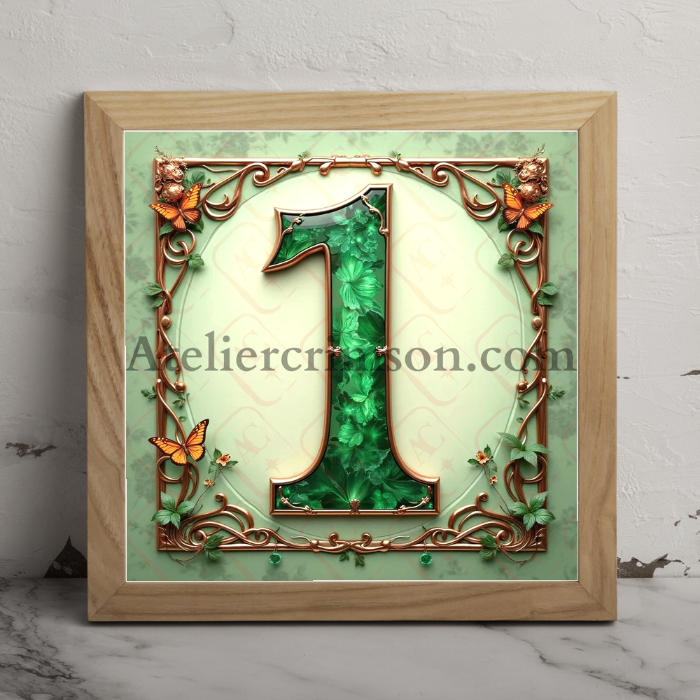 Number 1 emerald and copper Art Nouveau Intricate design with floral patterns, butterflies, and vines. Elegant sage green background. Perfect for vintage lovers and typography enthusiasts.
