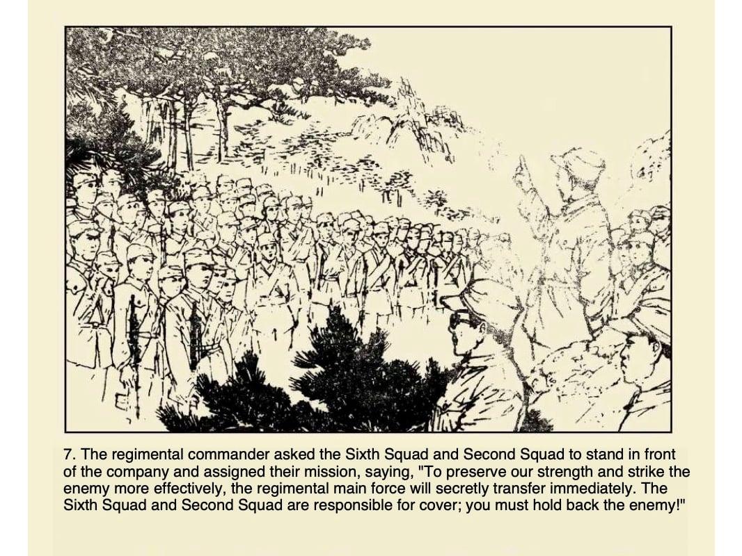 7. The regimental commander asked the Sixth Squad and Second Squad to stand in front of the company and assigned their mission, saying, "To preserve our strength and strike the enemy more effectively, the regimental main force will secretly transfer immediately. The Sixth Squad and Second Squad are responsible for cover; you must hold back the enemy!"