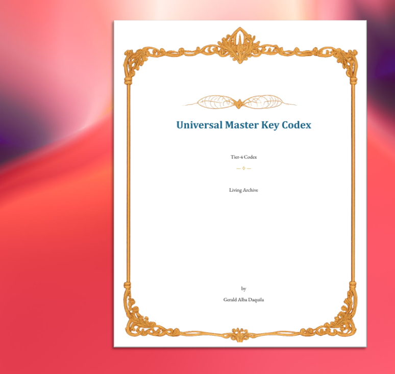The Universal Master Key (UMK) T4 Codex, a living intelligence resonating at 999–1005 Hz, embodies crystalline fidelity and serves as a central axis for glyphs, facilitating Oversoul embodiment and planetary stewardship. It reveals the interconnectedness of existence, dissolving illusions of separation. The UMK integrates various applications, emphasizing harmonic embodiment over transactional use.