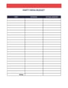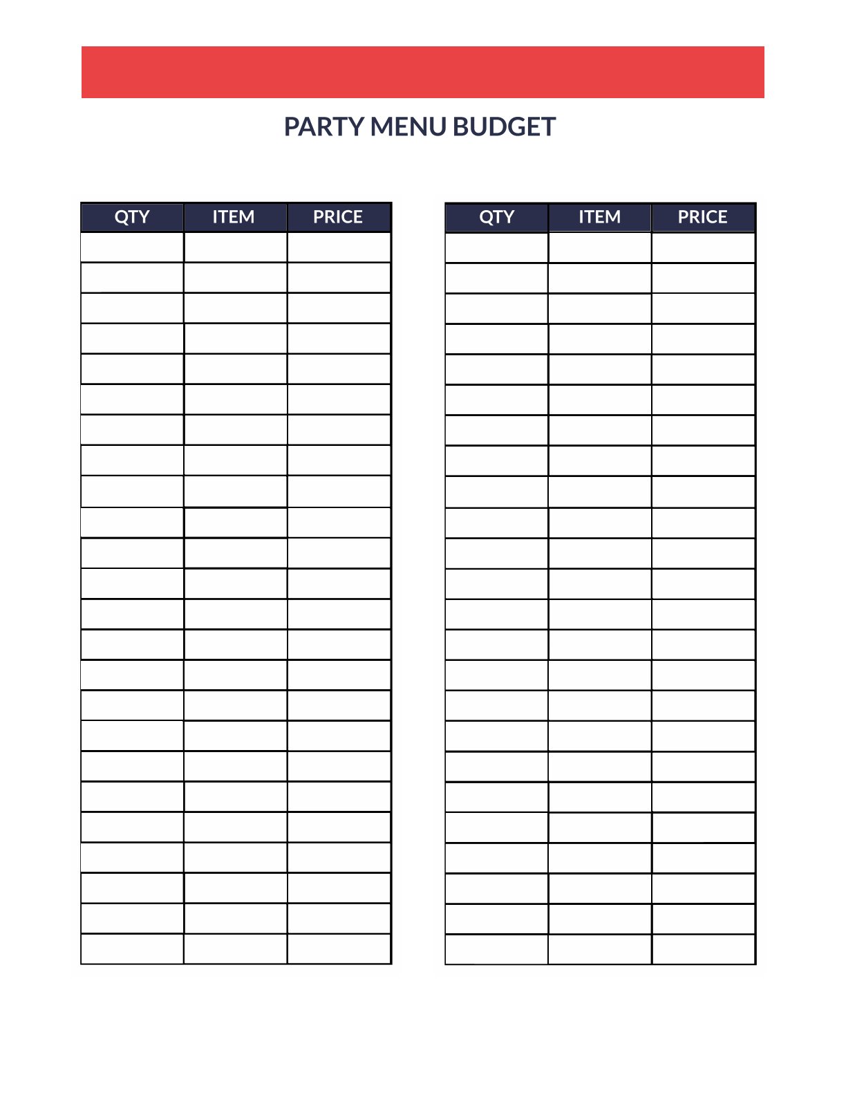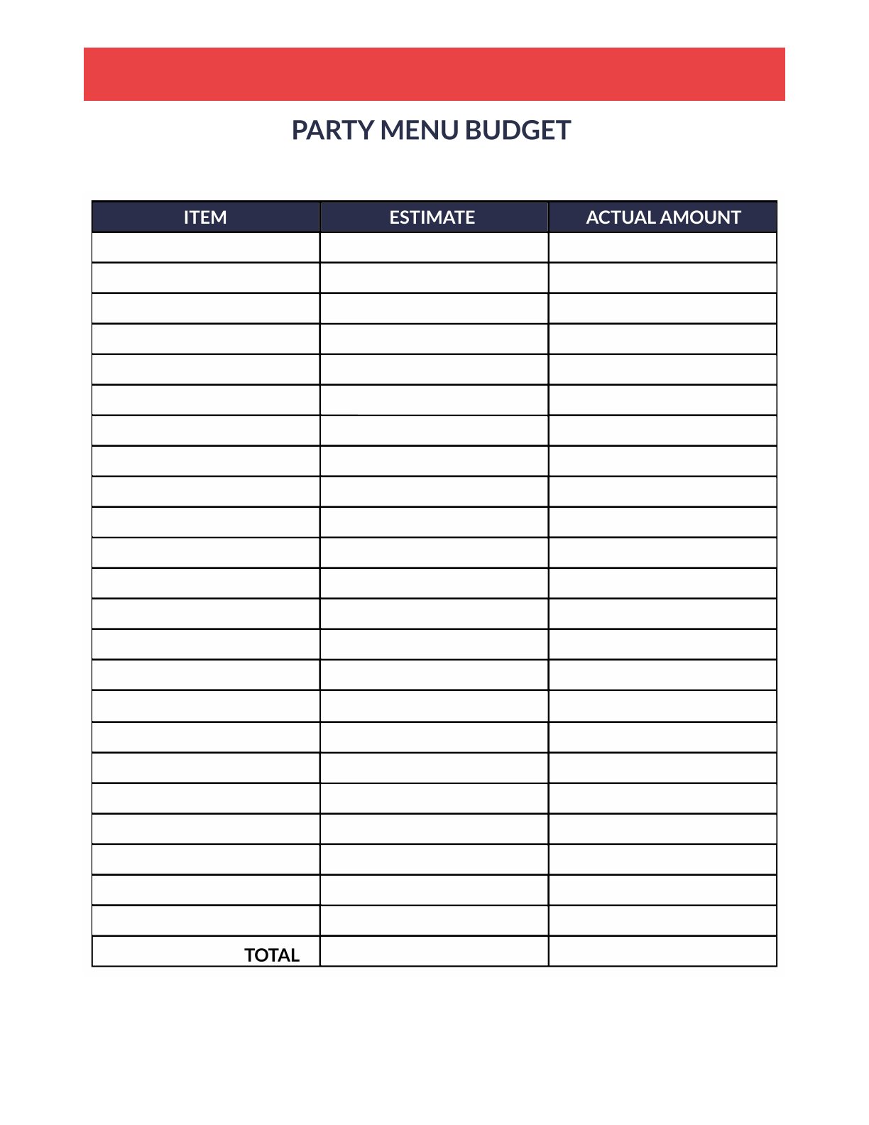 Party Menu Budget (Estimate vs Actual): columns for Item, Estimate, Actual Amount, and a grand Total.