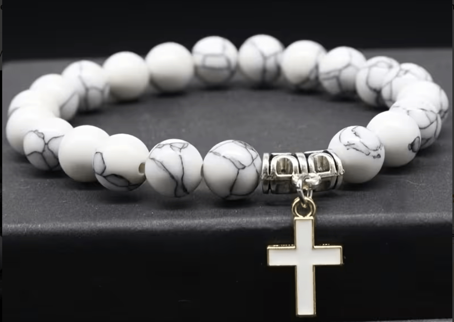 Elegant and serene, this White Howlite Beaded Bracelet with Gold Cross Pendant symbolizes peace, faith, and spiritual clarity. The natural howlite stones showcase delicate gray veining, giving each piece a unique and sophisticated look. Accented with a gold-trimmed cross, it’s the perfect Christian bracelet for women or men who want to express their faith with style.