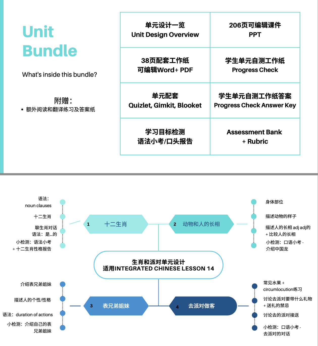 这套“生肖和派对”单元,采用反向设计(backward design)原理精心打造,旨在帮助学生在真实的语境中熟练掌握《中文听说读写》(Integrated Chinese) 课本第十四课《生日》的核心词汇和语法点。