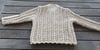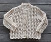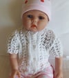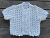This babies Cardigan is worked in an 8ply cotton yarn. It features a beautiful lace stitch which creates a gorgeous scalloped edge. It has a round neck, set in sleeves and the pattern includes both long and short sleeve options. The short sleeve version is photographed in size 0 months and the long sleeve version shows size 12 months.