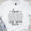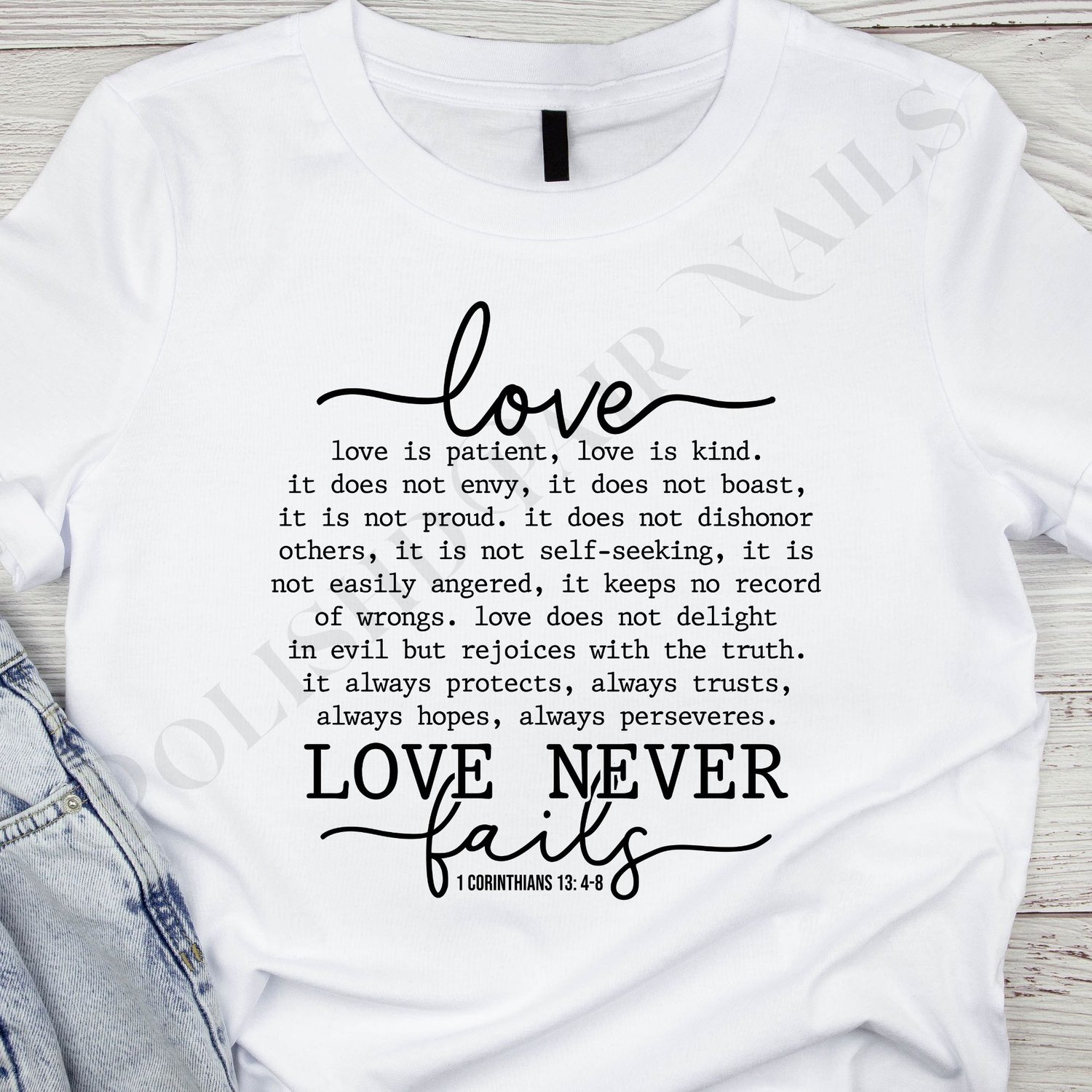 Embody the true essence of love with this profound 'Love Never Fails' t-shirt, featuring the timeless words from 1 Corinthians 13:4-8. The design showcases the powerful definition of love in a beautiful script and clear typography: 'love is patient, love is kind. it does not envy, it does not boast, it is not proud. It does not dishonor others, it is not self-seeking, it is not easily angered, it keeps no record of wrongs. love does not delight in evil but rejoices with the truth. It always protects, always trusts, always hopes, always perseveres.' The concluding statement, 'LOVE NEVER fails,' is elegantly highlighted.