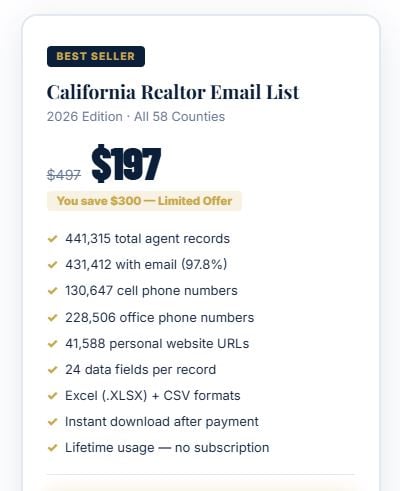 Data compiled from Realtor.com, Homes.com, RE/MAX, and state association directories — merged, cleaned, and deduplicated. With 431,412 records including an email address (97.8% coverage), this is among the most complete CA realtor databases available.