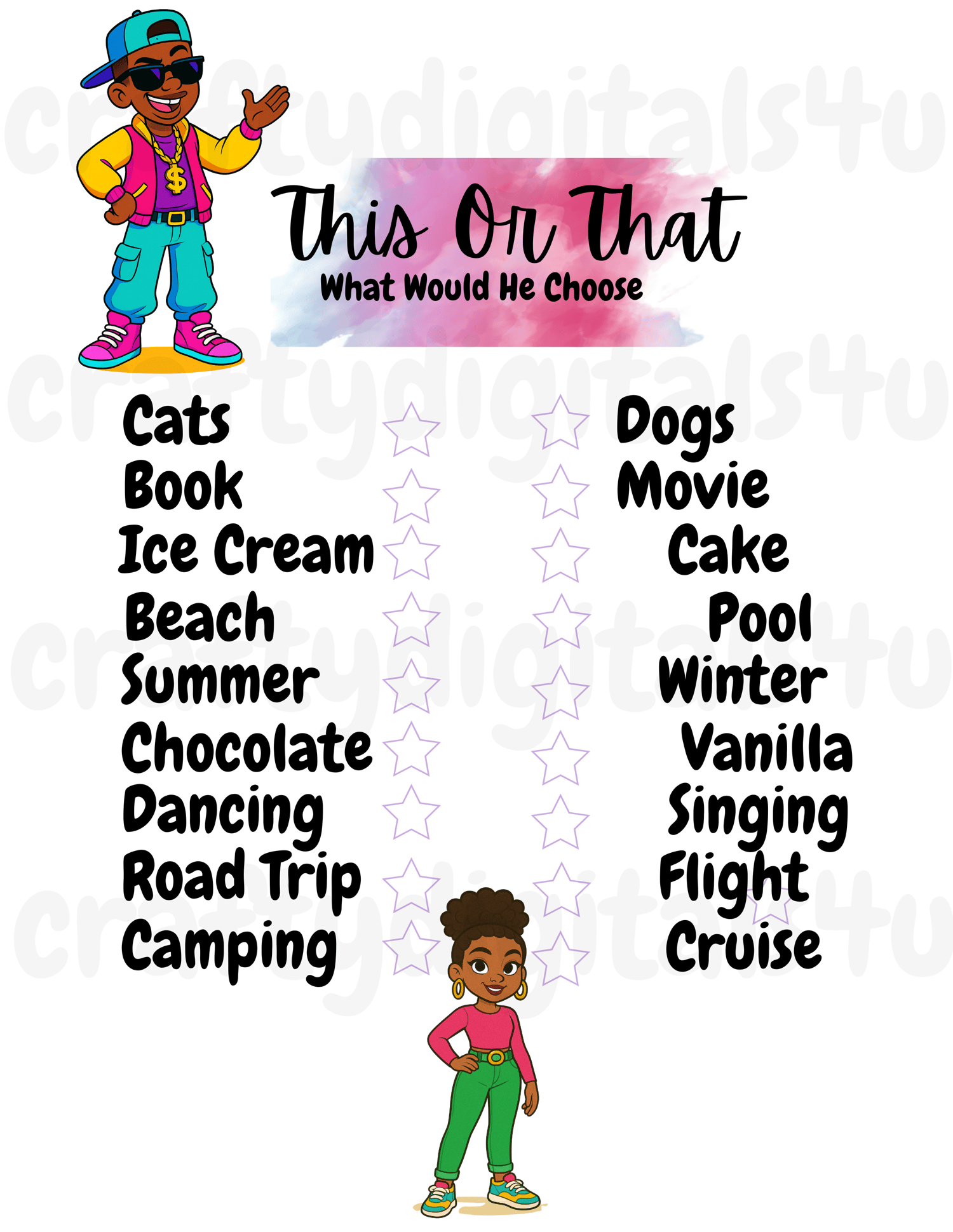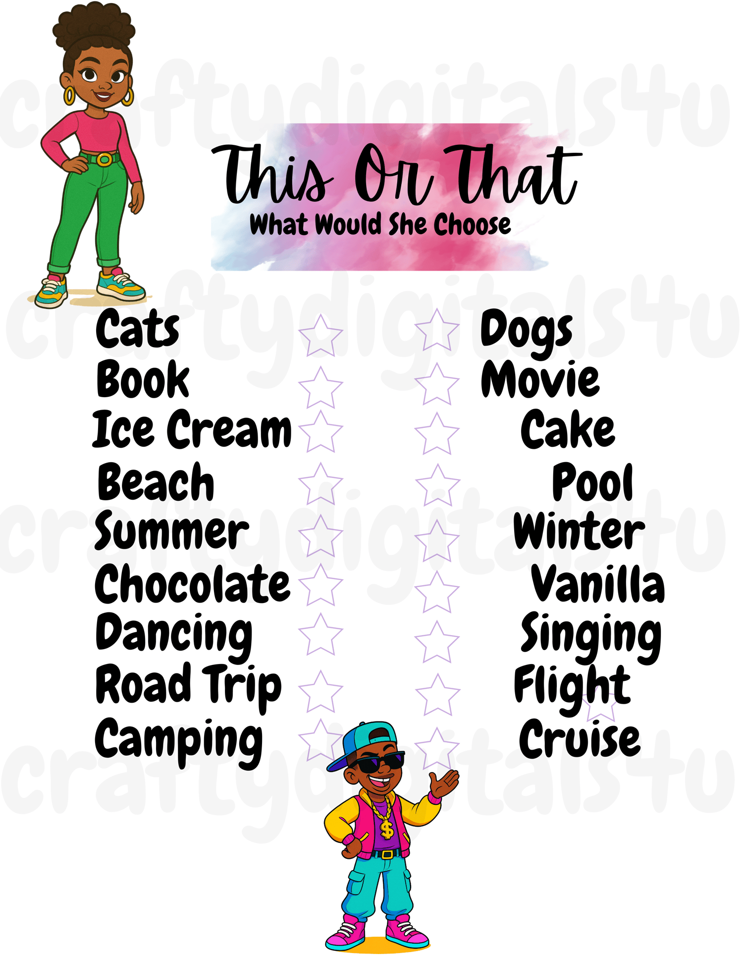 โ This or That: Guests choose which option best matches the birthday girlโs or boy's favorites!