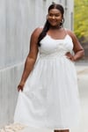 A stunning addition to your summer wardrobe. This dress combines comfort, style, and elegance all in one. Crafted from a lightweight woven material, it ensures a breathable and comfortable fit throughout the day. The V-neckline of this dress is enhanced with a delicate lace detail, adding a touch of femininity and sophistication. The sleeveless design allows for easy movement and keeps you cool during those warm summer days Our true-to-size fit ensures that this dress will flatter your figure without feeling too tight or too loose. The tailored silhouette creates a polished look that can be easily dressed up or down, making it suitable for various occasions.Pattern type: SolidStyle: Chic, ClassyFeatures: Swiss dot, LaceNeckline: V-neckLength: MidiSleeve length: SleevelessSleeve type: Spaghetti strapsHem shaped: A-lineSheer: NoBody: Not linedMaterial composition: 100% cottonStretch: No stretchCare instructions: Machine wash cold. Tumble dry low.ImportedModel information:Tiffany-height 5'9", bust 46", waist 37", hip 48", size 1X, jeans size 14WKacie-height 5'6", bust 34", waist 25", hip 35", size S, jeans size 1Product measurements:S: bust 30 in, length 45 inM: bust 32 in, length 46 inL: bust 34 in, length 47 inXL: bust 36 in, length 48 in1X: bust 38 in, length 49 in2X: bust 40 in, length 50 in3X: bust 42 in, length 51 inWhite Birch is a women's clothing line, founded and based in downtown LA. Their customers are at the heart of their company, with styles designed with them in mind.