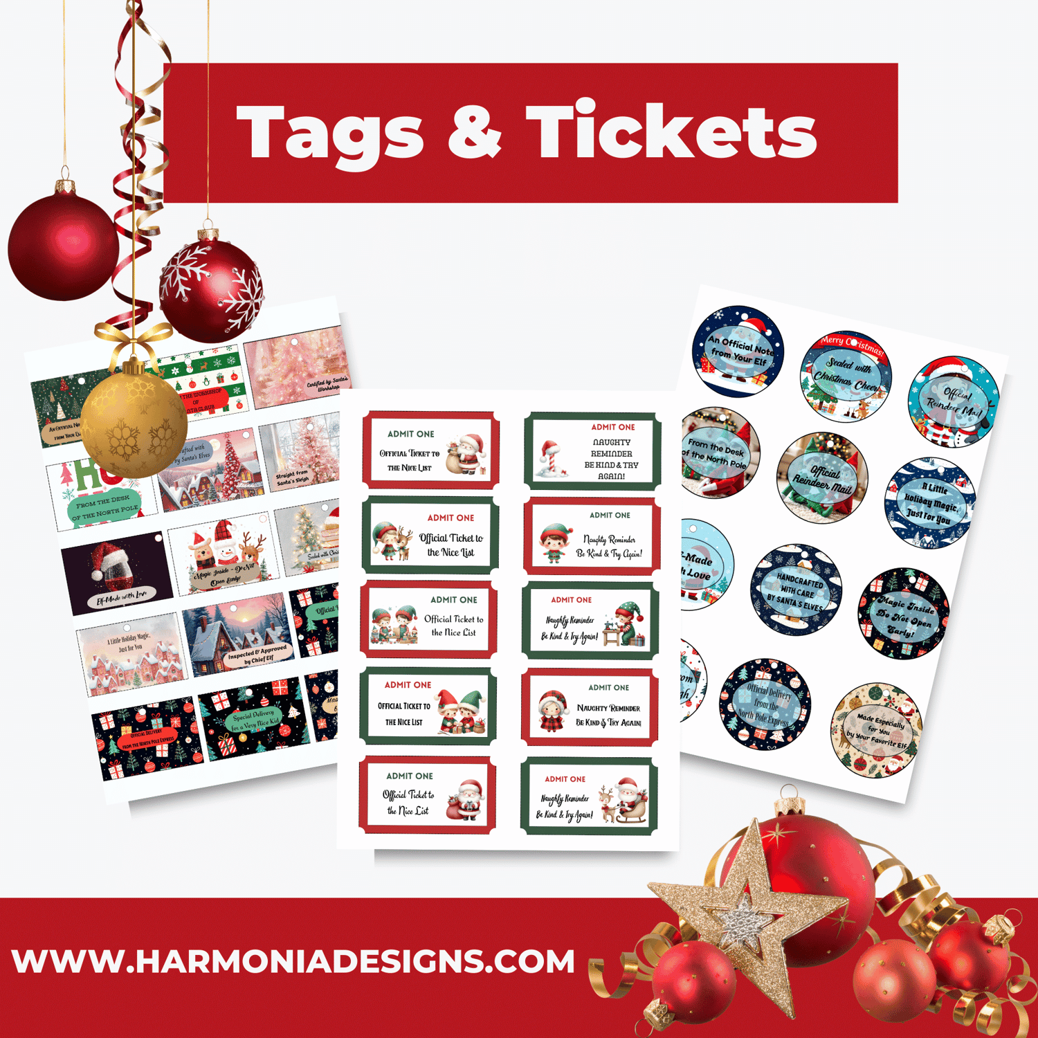 Contains printable gift tags in circle and rectangle, 12 per page. Plus naughty/nice tickets to encourage good behavior!