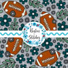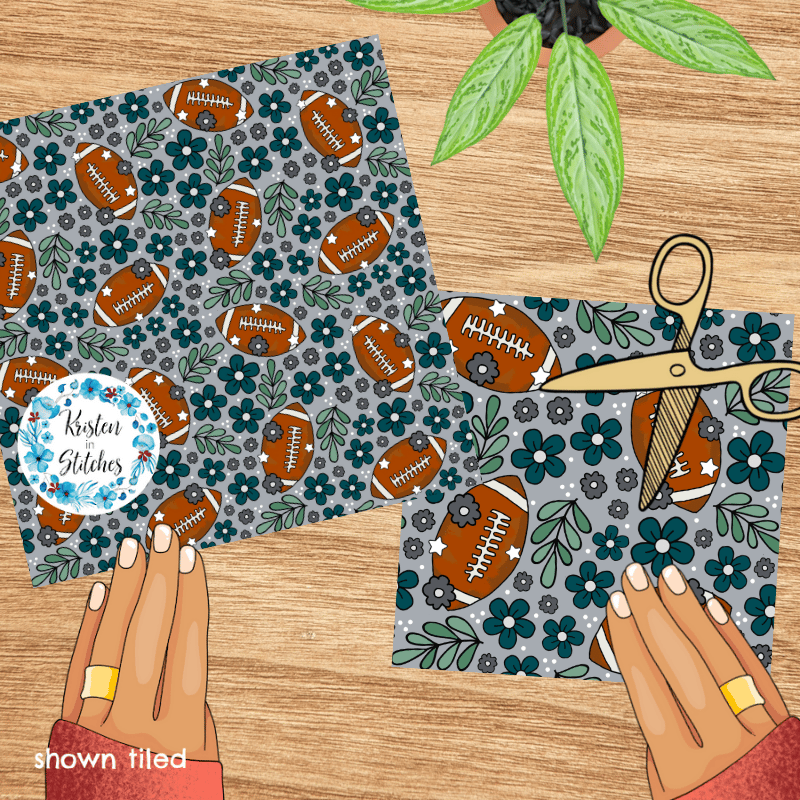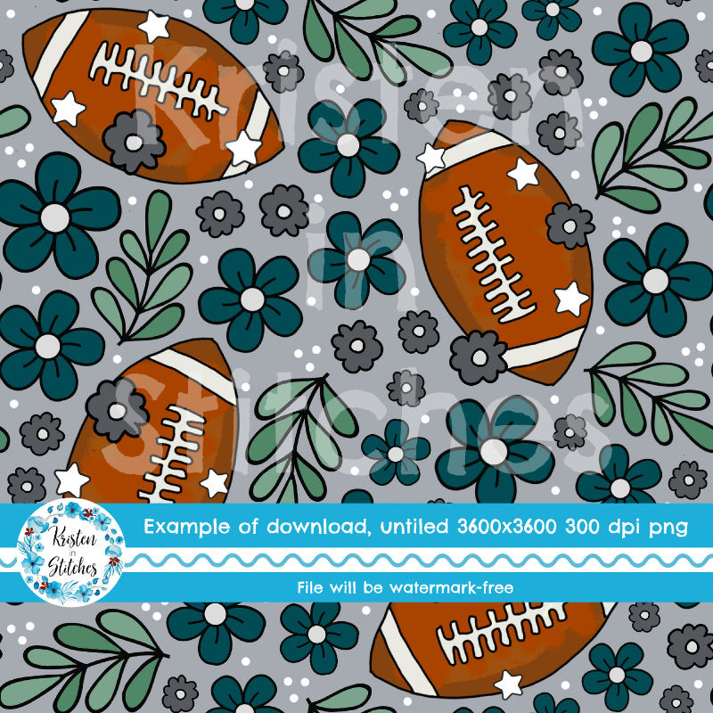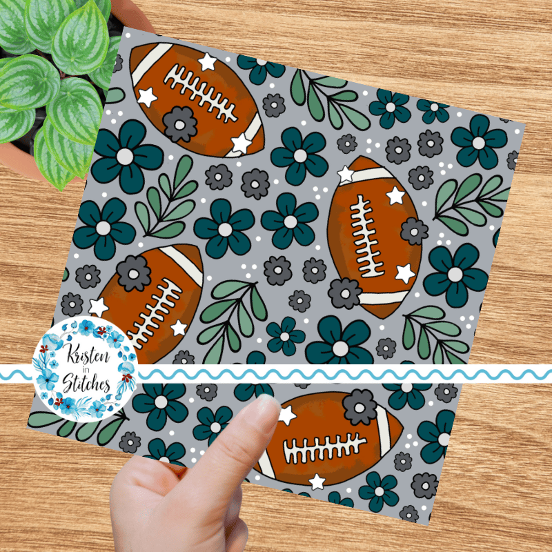 Footballs and flowers with Philadelphia Eagles colors Midnight green, silver grey and white.