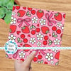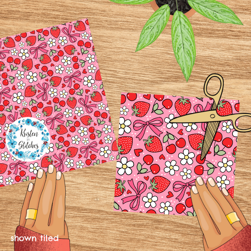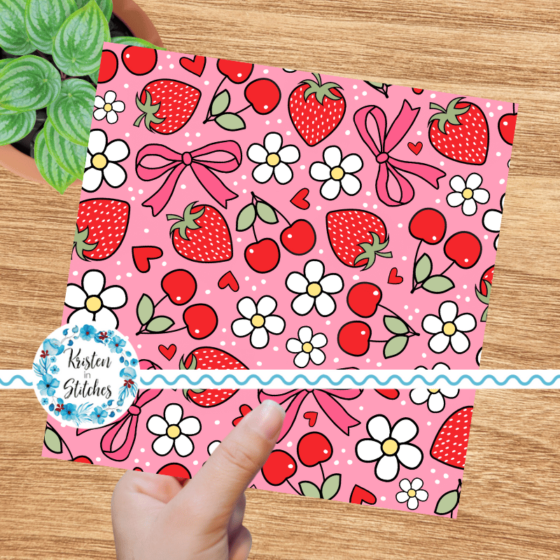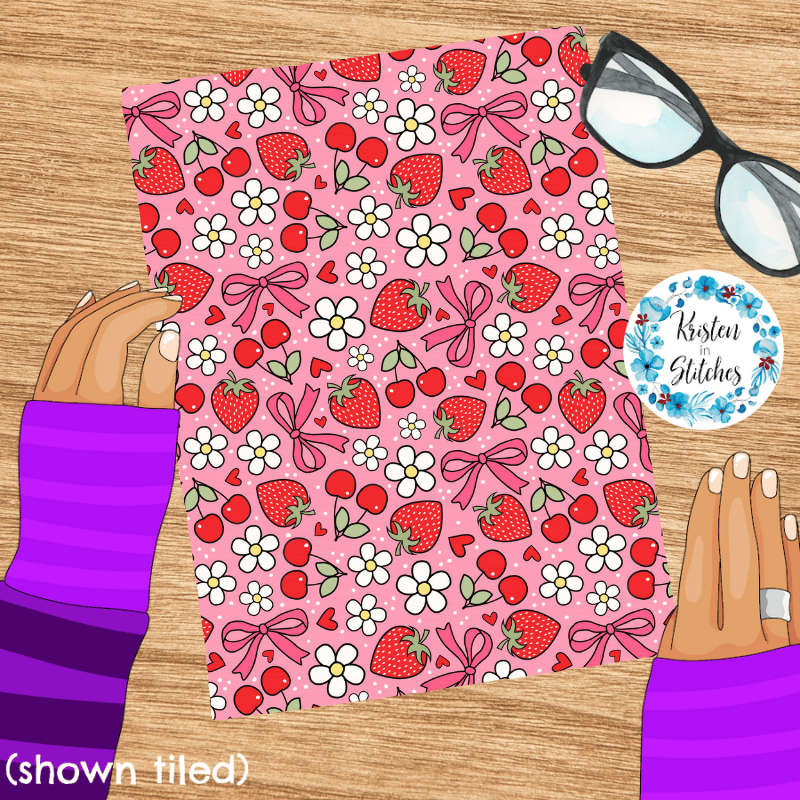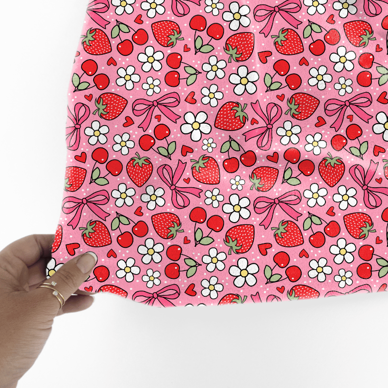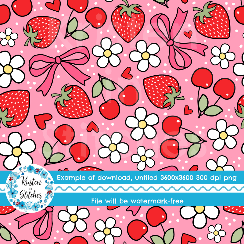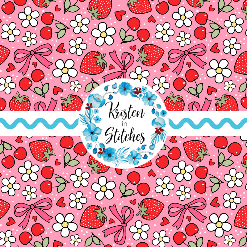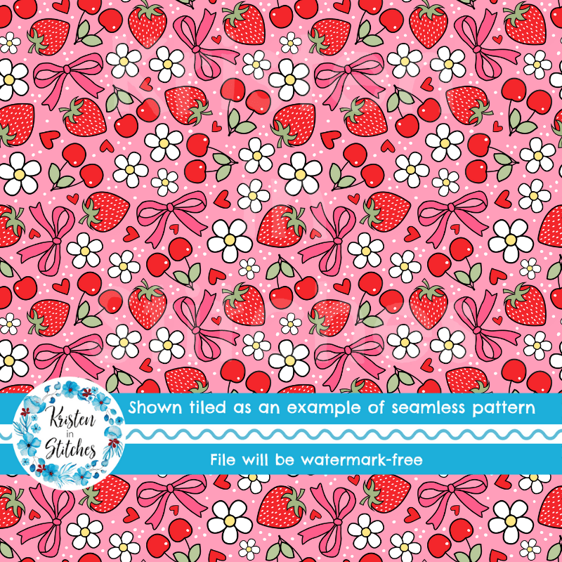 Coquette Strawberries Cherries and Bows Floral Seamless Pattern, Red Strawberry Cherry Daisy Flowers
