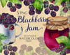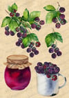 Blackberry: berries & leaves, glass jar of jam, iron mug.