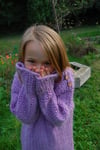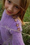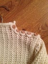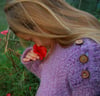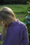 Knit flat in pieces and then sewn together. It features a modified drop shoulder, and a fun little shell detail for the buttoned shoulder (you don’t need to be able to crochet, but you will need a hook for this).