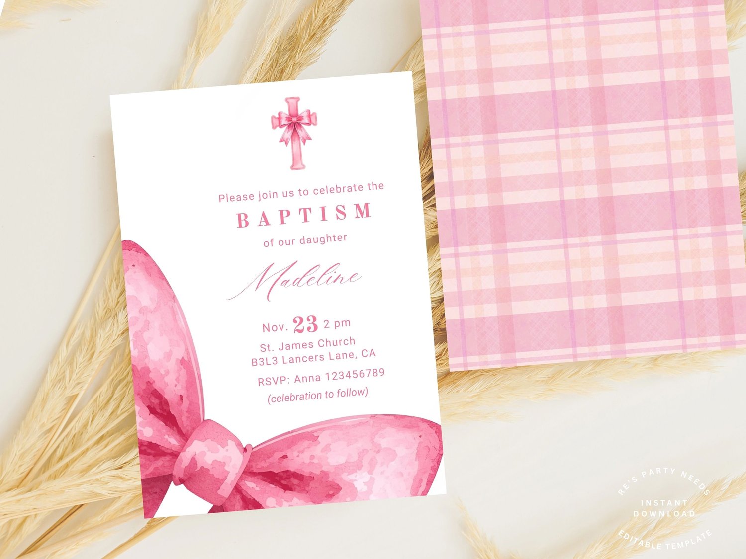 Celebrate your little girl’s special day with this elegant pink baptism invitation featuring a soft watercolor cross and bow design. Perfect for baptisms, christenings, or naming ceremonies, this editable invitation is designed to be timeless, feminine, and easy to personalize.