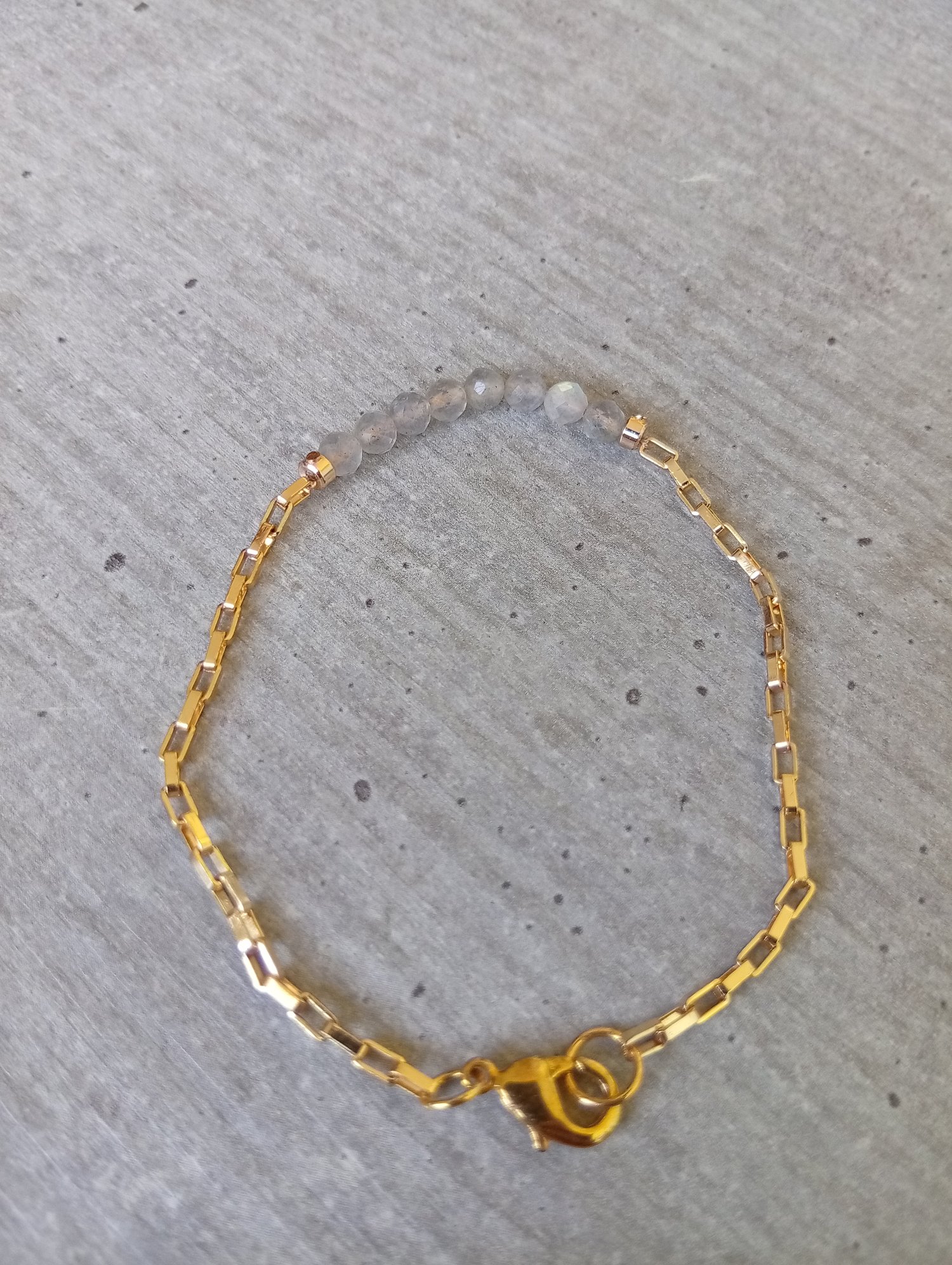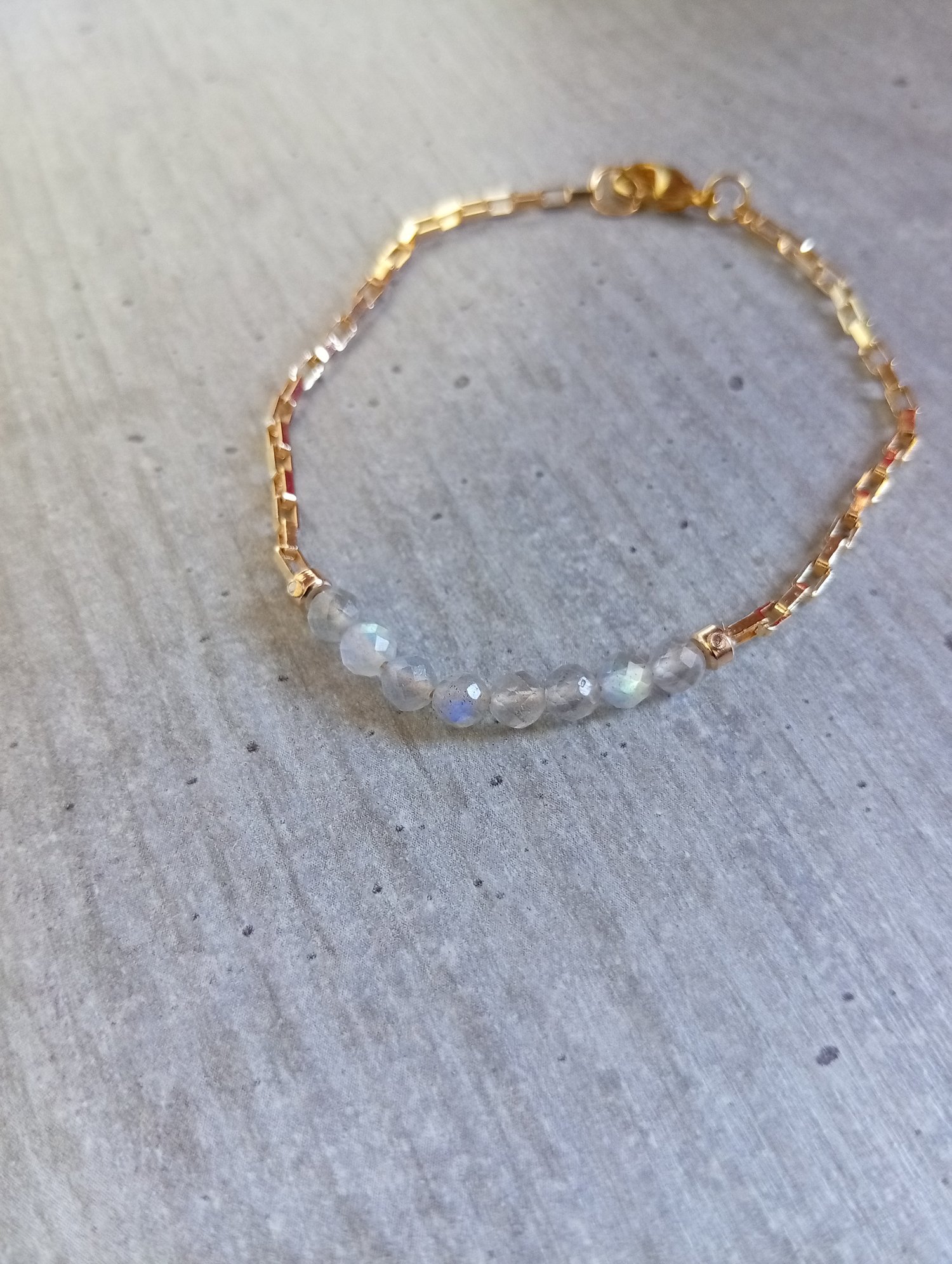 Bracelet délicat en labradorite facettée de 4 mm, montée sur chaîne dorée. À la fois discret et profondément protecteur, ce bijou capte la lumière avec ses reflets subtils tout en offrant un soutien énergétique puissant.
