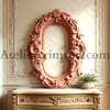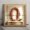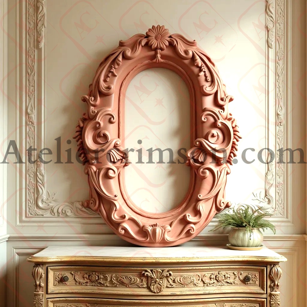 The letter O terracotta Art Nouveau typeface inspired by Alphonse Mucha's with flowing lines and floral motifs, set against a soft, muted background with a gilded wooden dresser and subtle lighting effects.