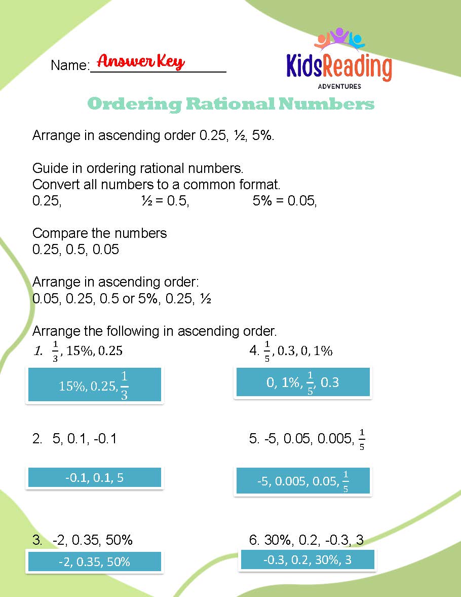 4. **Ordering Rational Numbers:** Master the art of ordering rational numbers with structured practice activities. Students will refine their skills in arranging rational numbers in ascending or descending order, honing their logical reasoning abilities.