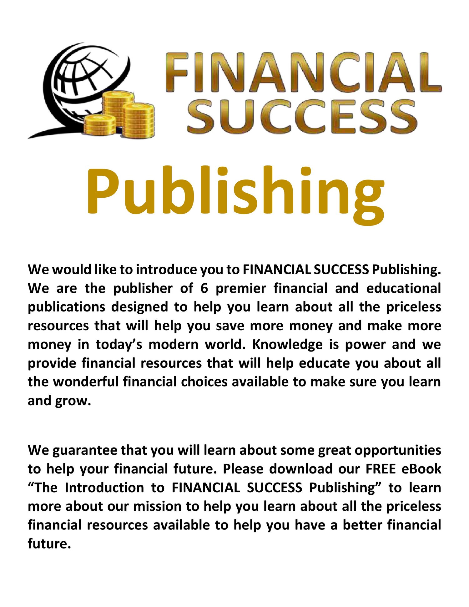 Please Download a FREE copy of our eBook " The Introduction to FINANCIAL SUCCESS Publishing"